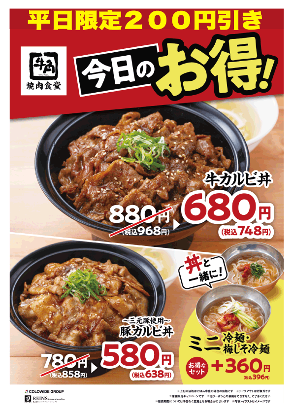 平日限定!牛カルビ丼と豚カルビ丼が200円引き!!