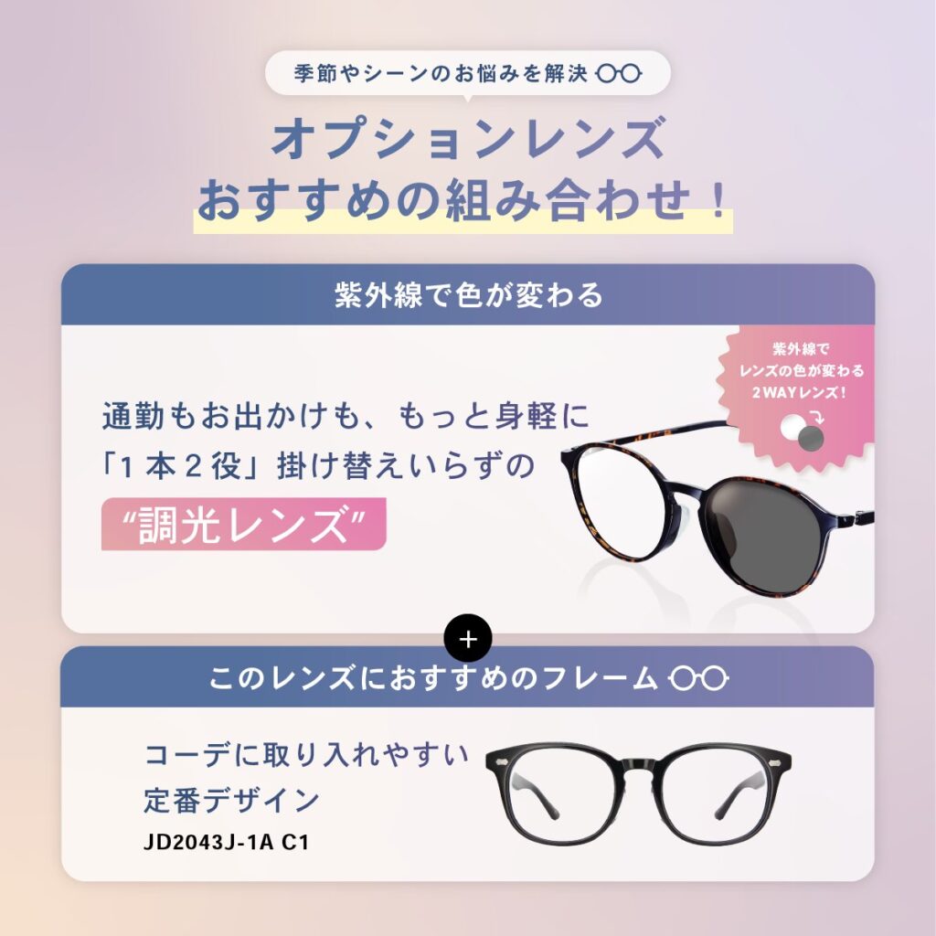 【調光レンズ+定番フレーム】なら、1本2役で幅広いシーンで活躍◎