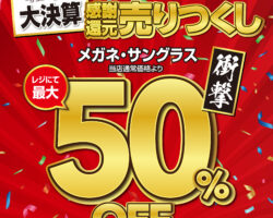 日頃のご愛顧に感謝を込めて。 メガネの愛眼、決算SALEを今年も開催いたします! 今すぐ使えるトレンドのメガネから、これからの季節に欠かせないサングラスまで、店内該当商品が最大50%OFF。 在庫限りの「売りつくし」となりますので、ぜひお早